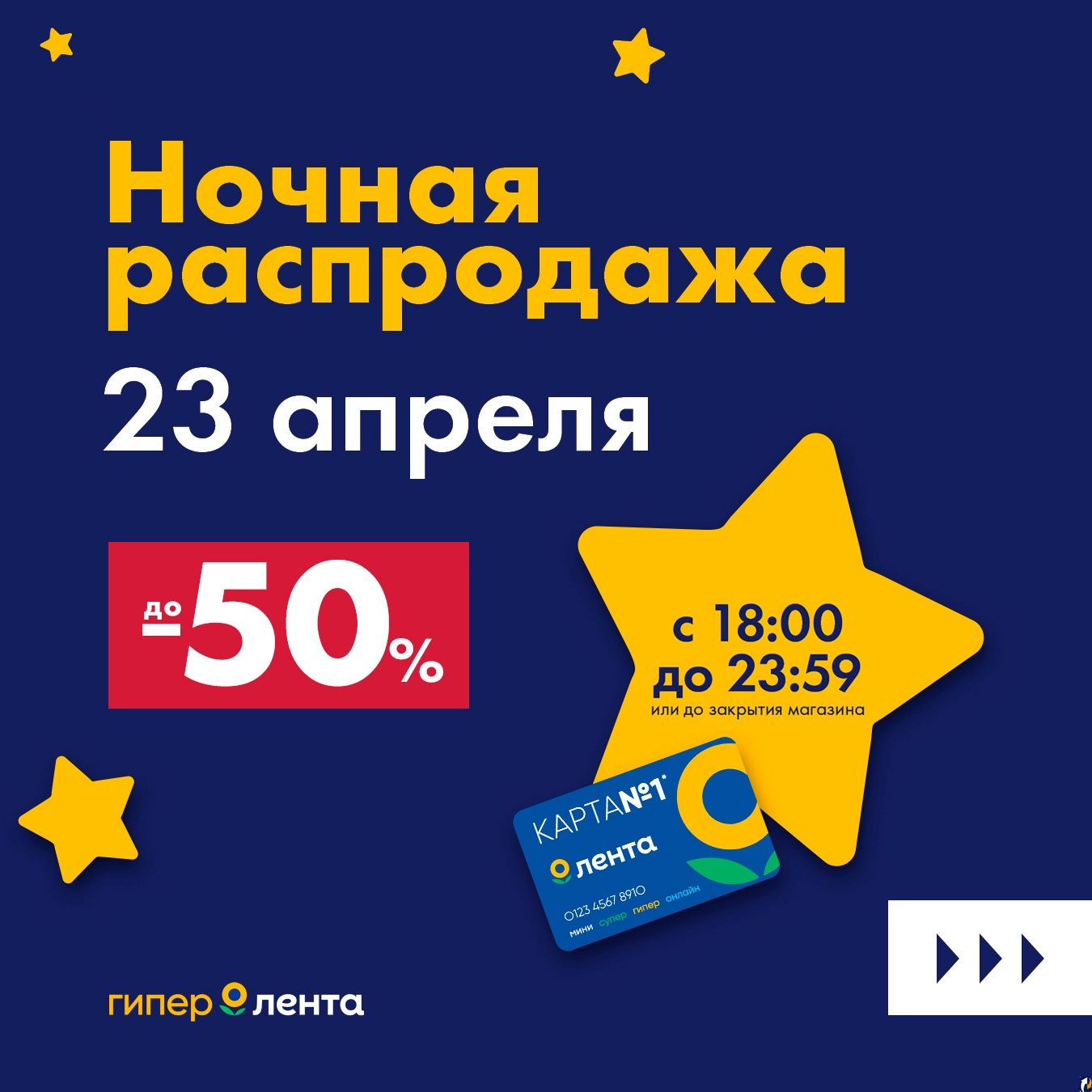 Скидки до -50%! В эту субботу вам точно будет не до сна!Приглашаем всех на «Ночную распродажу» 23 апреля с 18:00 до 23:59 или до закрытия в магазинах торговой сети "Лента"! Организаторы акции приготовили большие скидки на ваши любимые товары! Сластёны будут рады сладким наборам, а хозяйки – актуальному пасхальному декору и другим необходимым товарам.