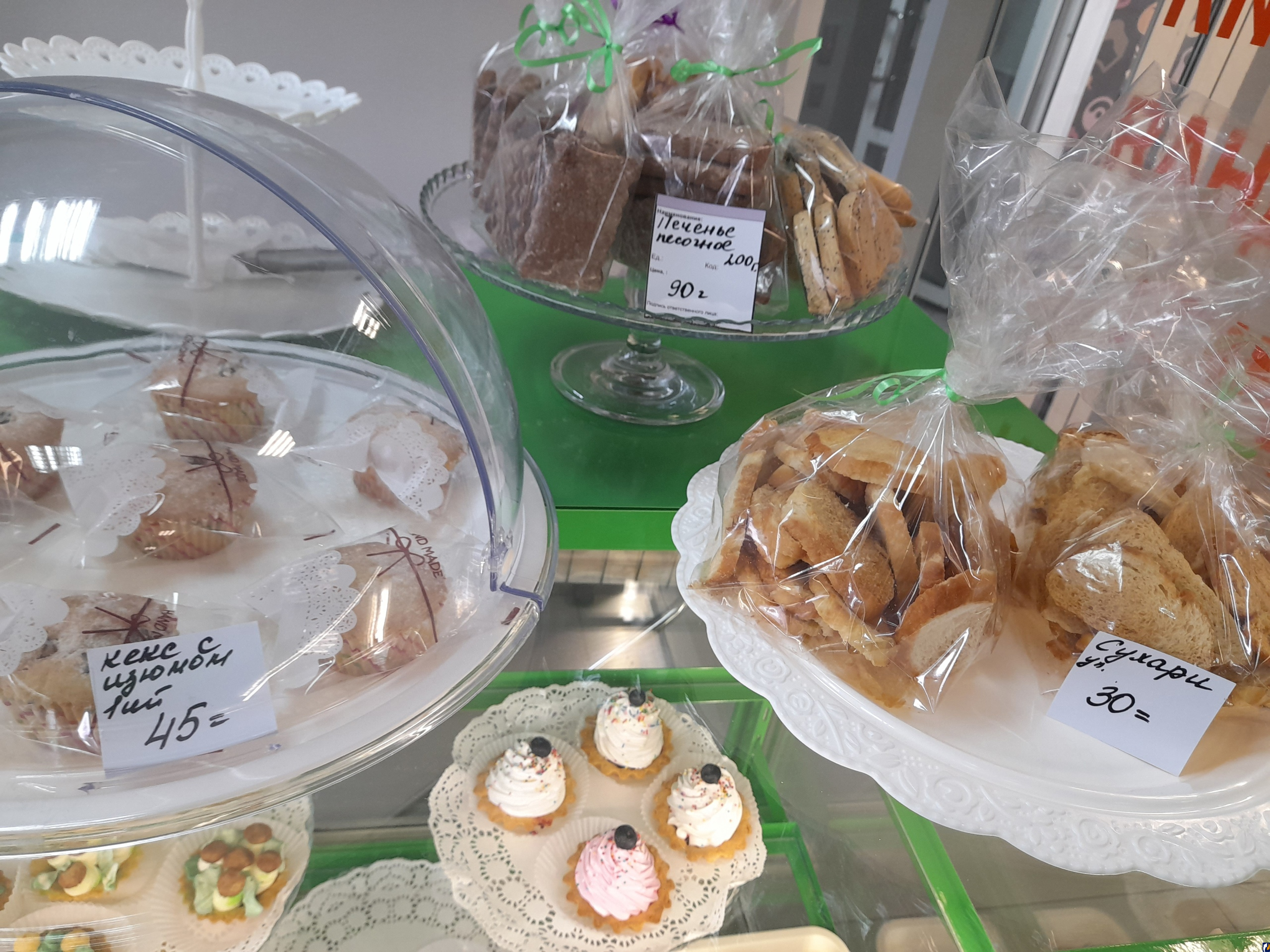 Здесь можно найти свежие пирожные, оригинальный зефир, ароматные, ещё тёплые пирожки и пока только чёрный чай, кофе и вода.