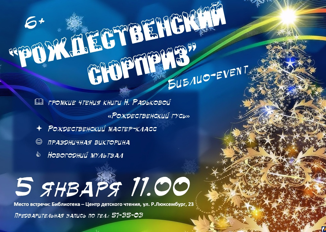 Библиотека – Центр детского чтения на улице Розы Люксембург 5 января приглашает своих самых маленьких читателей на библио-event «Рождественский сюрприз». В программе, которая начнётся в 11.00, рождественские чтения, новогодняя викторина, мастер-класс и просмотр новогодних мультфильмов.