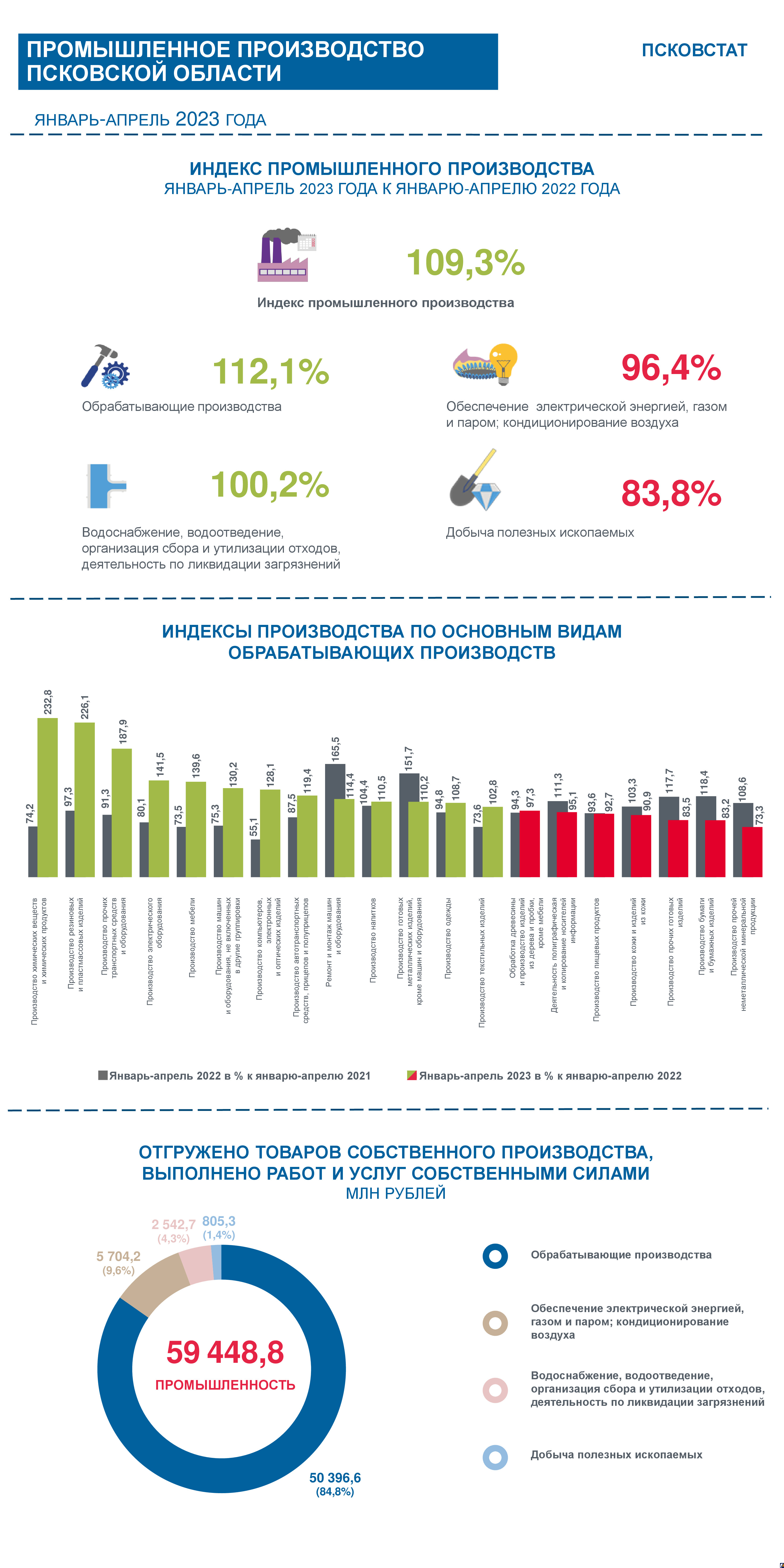 Отгружено товаров собственного производства, выполнено работ и услуг собственными силами по промышленным видам деятельности в январе-апреле 2023 года на сумму 59,4 млрд рублей. Доля продукции обрабатывающих производств составила 84,8%.