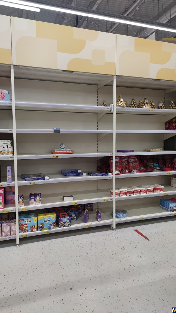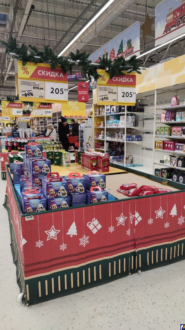 На данный момент ряд полок заметно опустели, а стойки со сладкими подарками выглядят тоже выкупленными. Это объясняется тем, что магазину не обязательно пополнять предложение сладких подарков, ведь с завершением новогодних праздников закончится спрос на эти категории товаров.