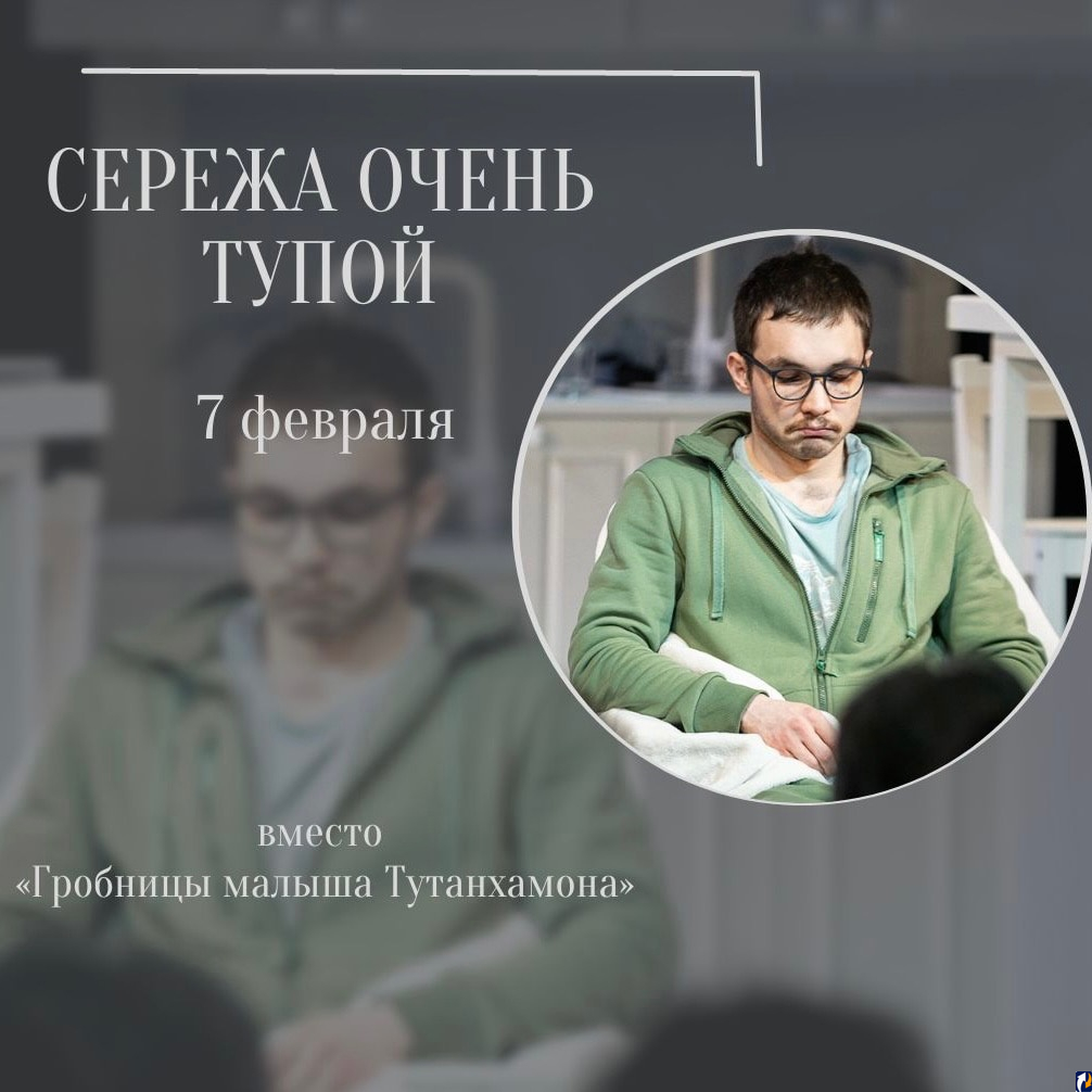 Изменения в афише произошли в связи с болезнью актрисы, поэтому 7 февраля вместо спектакля «Гробница малыша Тутанхамона» будет показан спектакль «Сережа очень тупой».