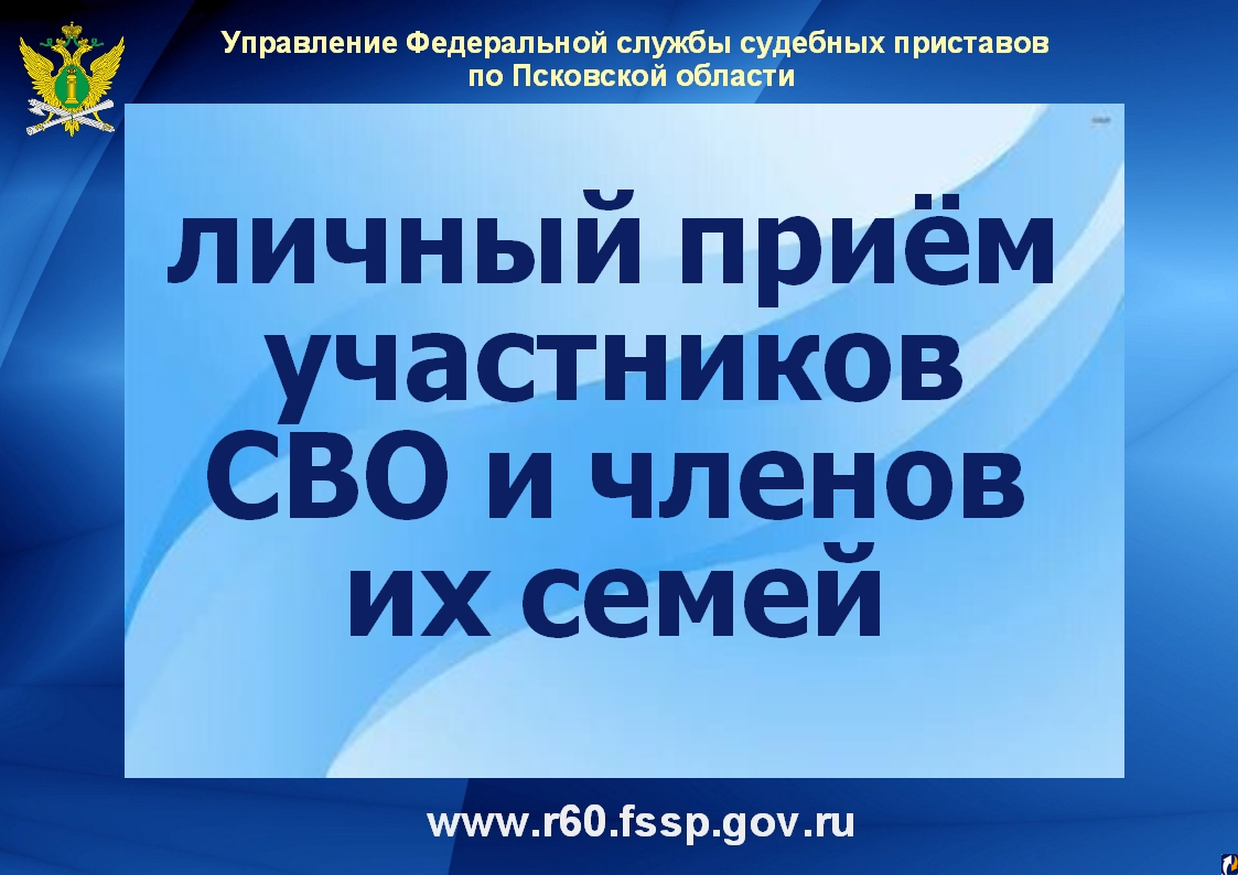 Судебные приставы проведут личный прием жителей Псковской области в целях оказания адресной консультативной помощи членам семей мобилизованных граждан, а также гражданам, проходящих службу в Вооруженных Силах Российской Федерации и принимающих участие в специальной военной операции.