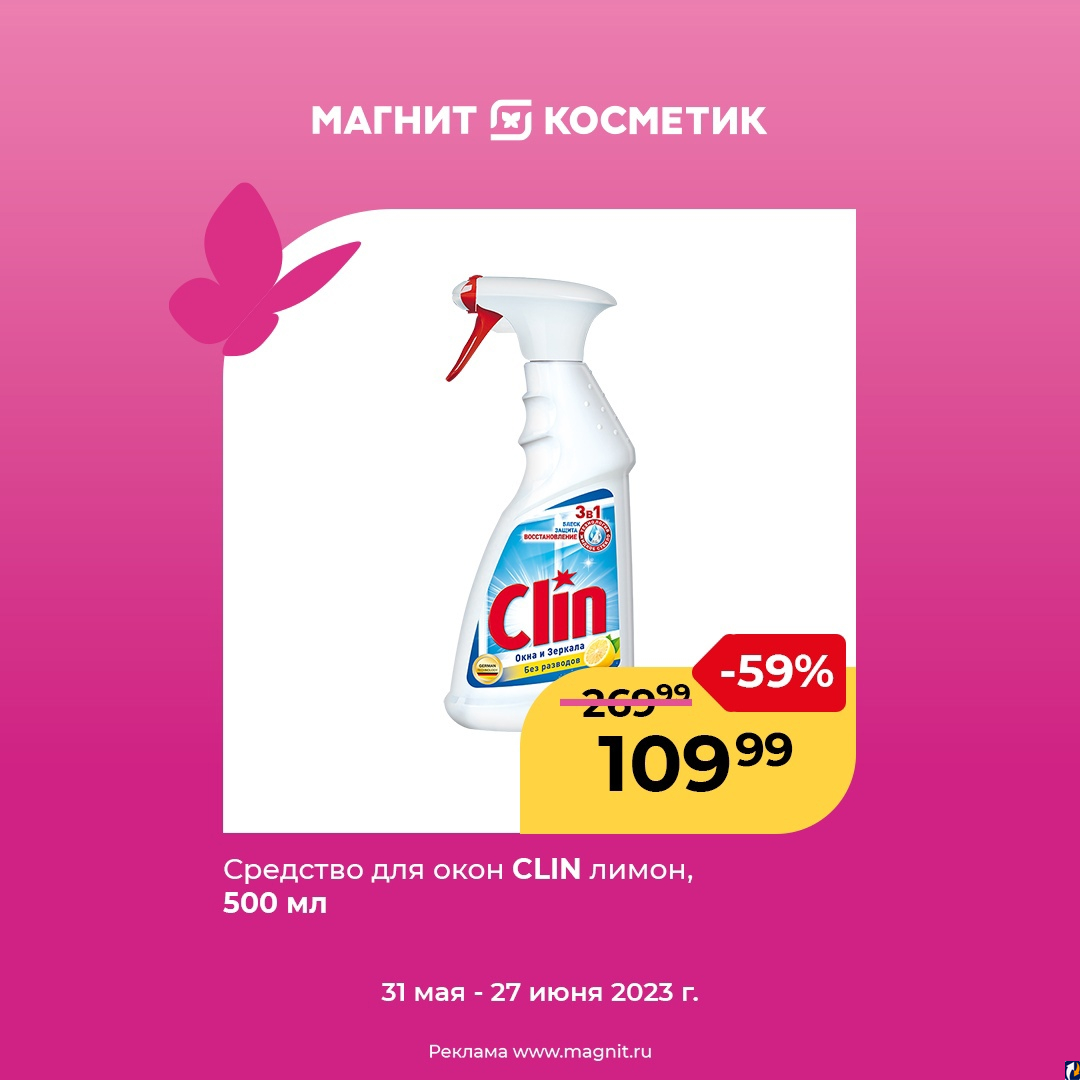 Скидка 59% на средство для окон Clin «Лимон», чтобы вы видели в уборке только плюсы. Предложение действует в магазинах торговой сети "Магнит Косметик". До 27 июня псковичи смогут вернуть четкость отражениям и пейзажу за окном, а еще и не потратить при этом уйму денег.