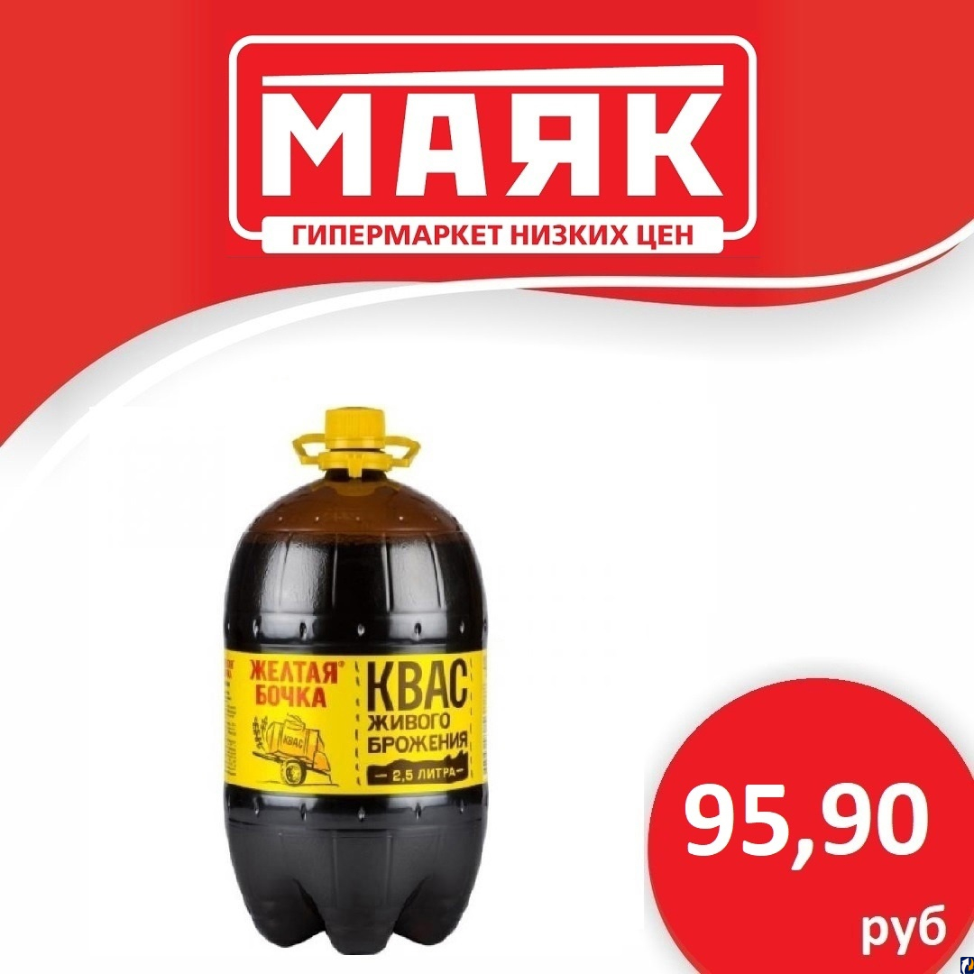 - Квас "Желтая бочка" 2,5 л продается по 95,90 рублей