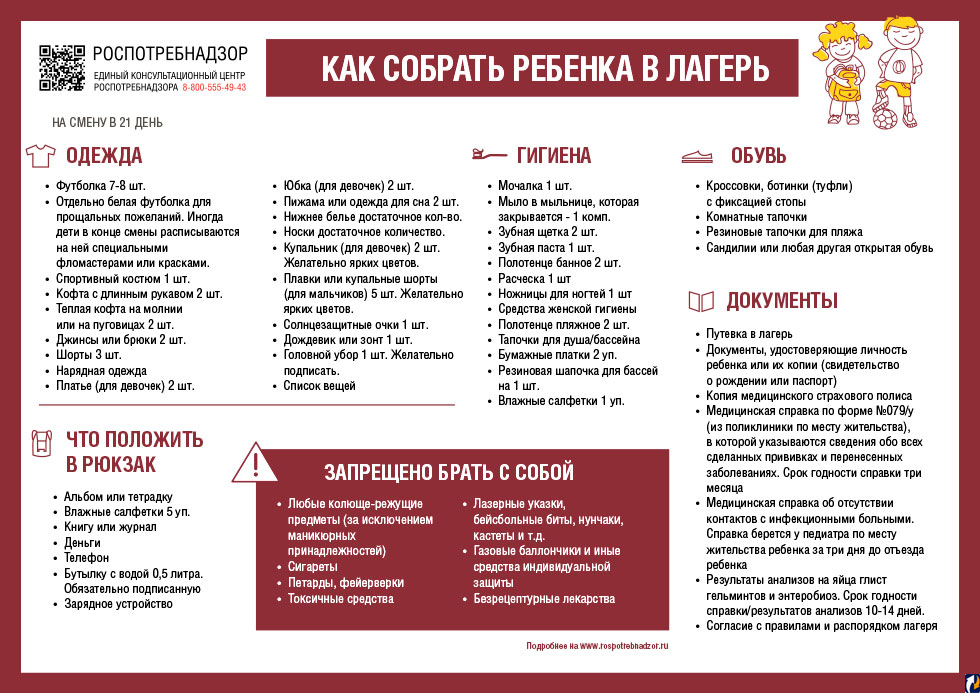 Количество вещей, которые вы планируете дать ребенку с собой, необходимо рассчитать на смену в 21 день.