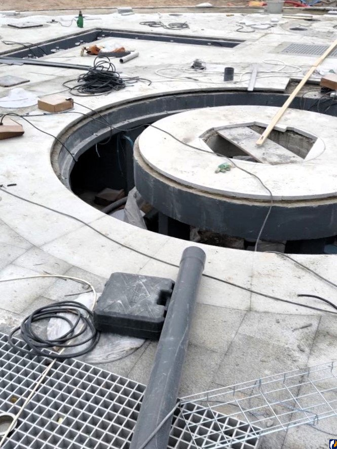 В техническом помещении, которое находится на глубине около 4 метров, подрядная организация производит подключение и монтаж насосного оборудования. В ближайшее время строители приступят к монтажу кабельных лотков, устройству заземления и установке щитов в электрощитовой. Кроме того, идет укладка гранита и плитки в чаше фонтана.