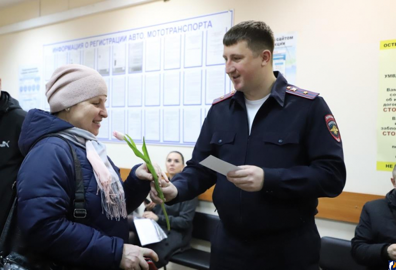Полицейские поздравили девушек с Международным женским днем в местах оказания госуслуг