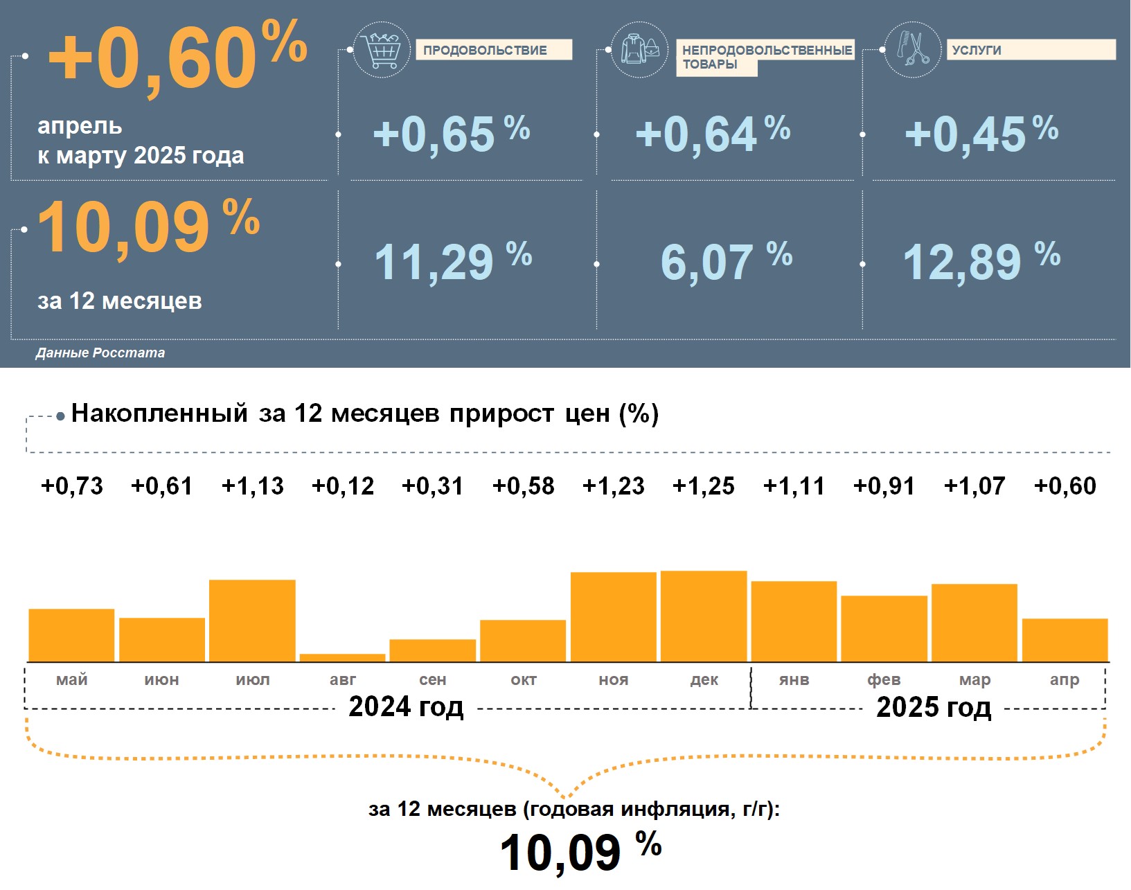 Цены в Псковской области в апреле 2025 года, по данным Росстата, выросли на 0,60% к марту. Годовая инфляция повысилась и составила 10,09%. Это ниже, чем в целом по стране (10,23%).