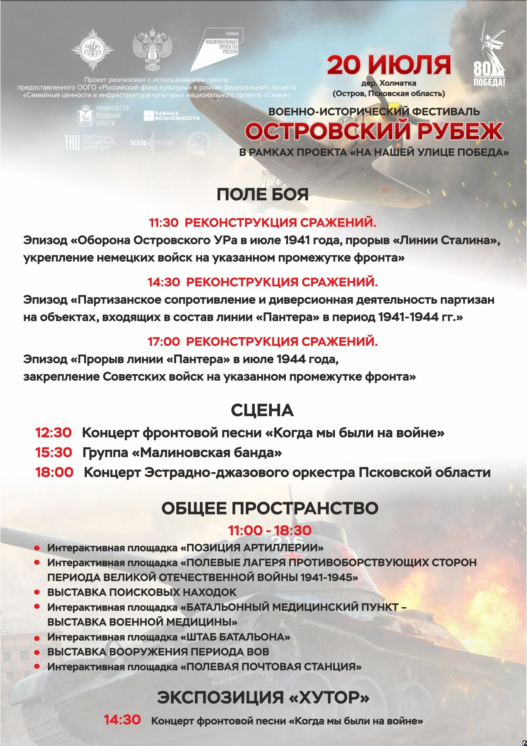 20 июля в деревне Холматка Островского района пройдет военно-исторический фестиваль «Островский рубеж», организованный в рамках проекта «На нашей улице Победа».