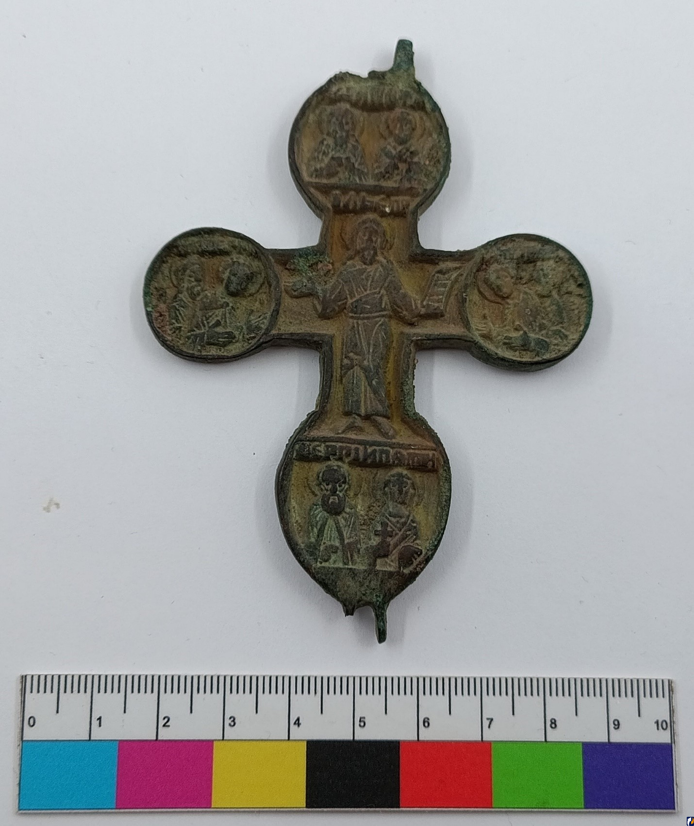 Выяснилось, что была восстановлена створка энколпиона (складной двустворчатый крест) из медного сплава с композицией «Пророк Илия», созданная в середине XV – 1-ой половине XVI вв. Атрибуция и датировка предмета проводилась по имеющимся аналогиям. Наиболее близким аналогом стал бронзовый энколпион с изображением Распятия и Ильи Пророка, происходивший из Довмонтова города и хранящийся в Эрмитаже.
