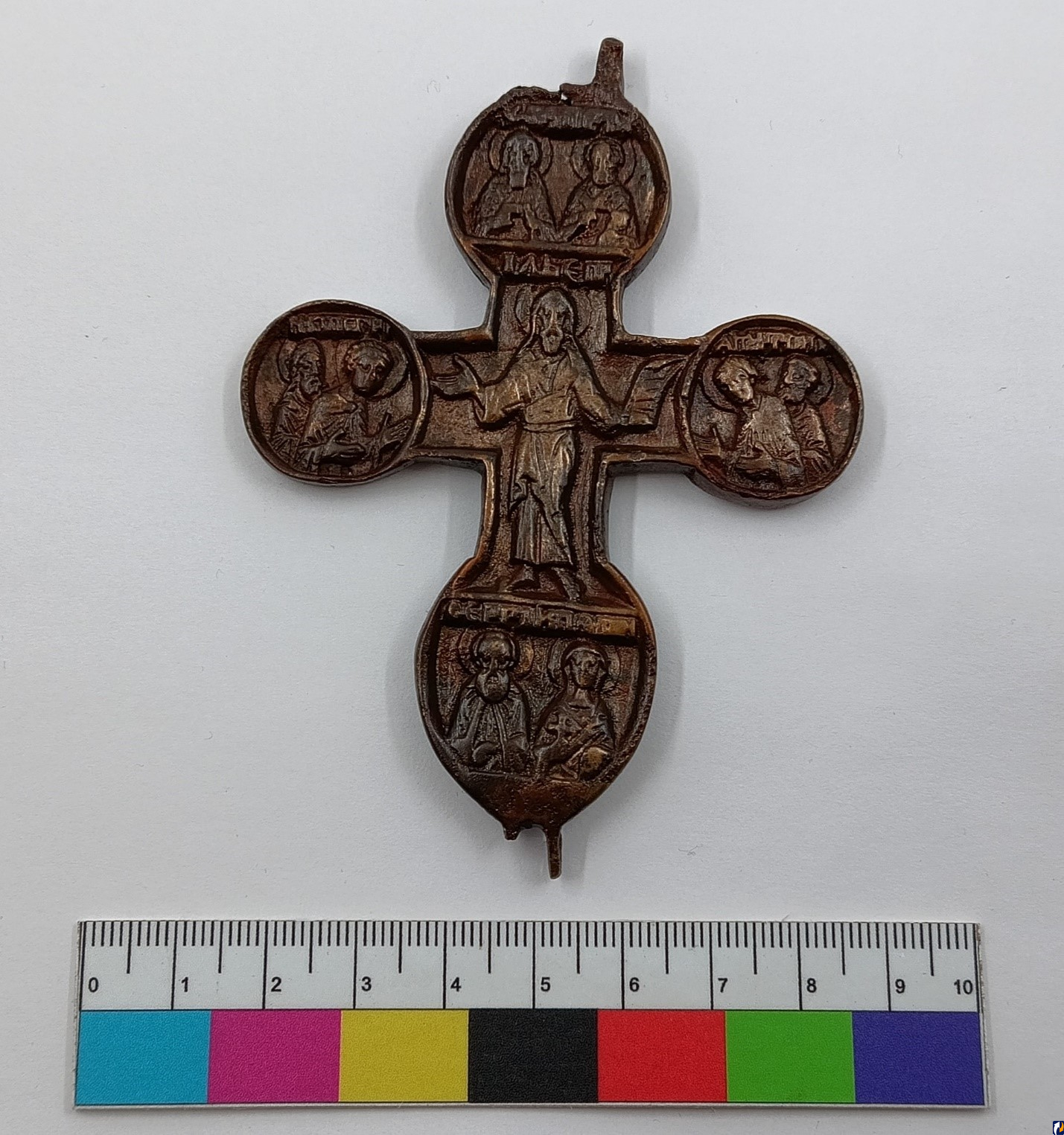 В мастерскую поступил предмет, именуемый в музейной базе – крест четырехконечный (кон. XIX – нач. XX вв.). У предмета имелись плотные слои органических загрязнений, смешанных с продуктами коррозии. Изображения и тексты были не читаемы.