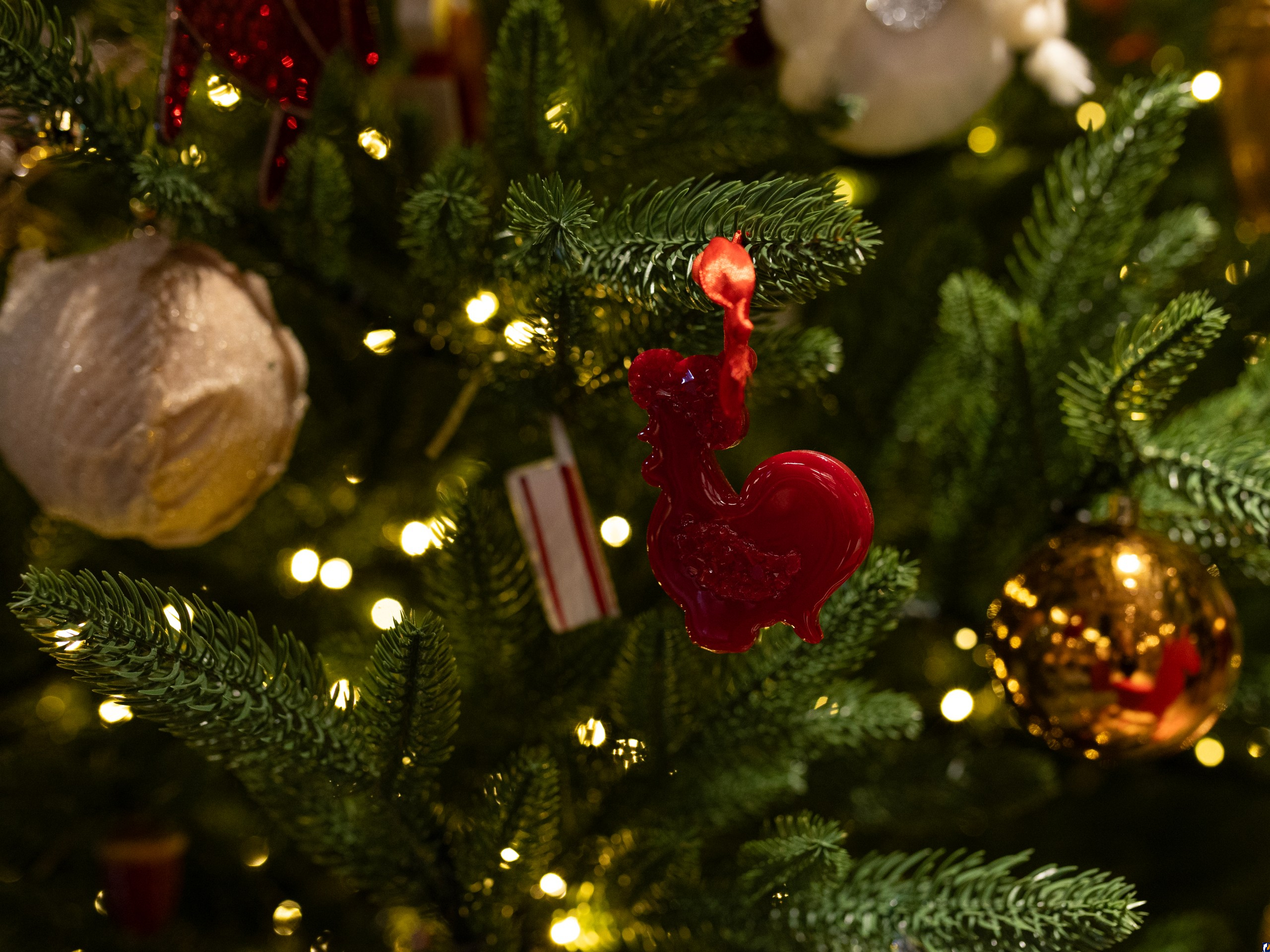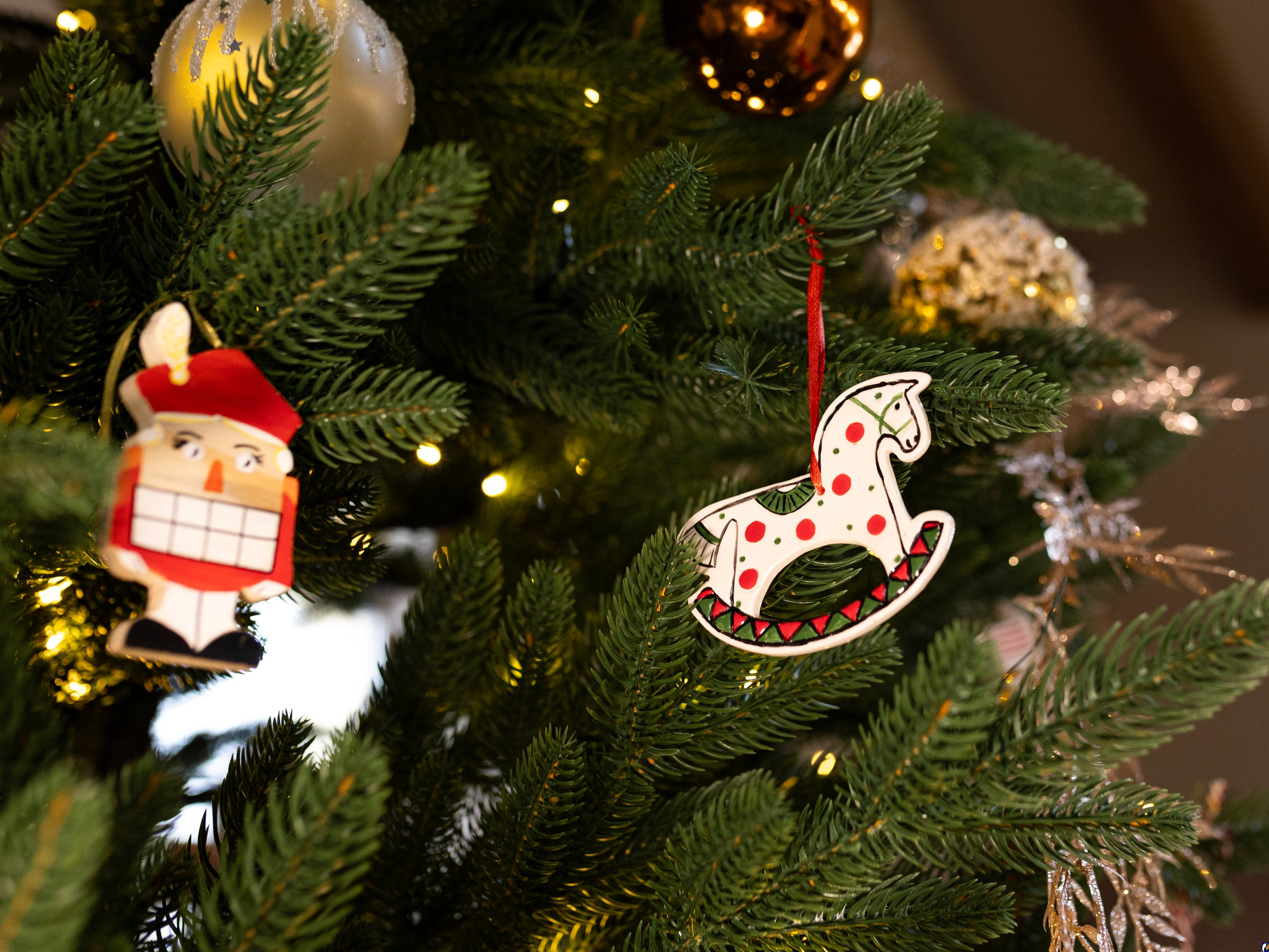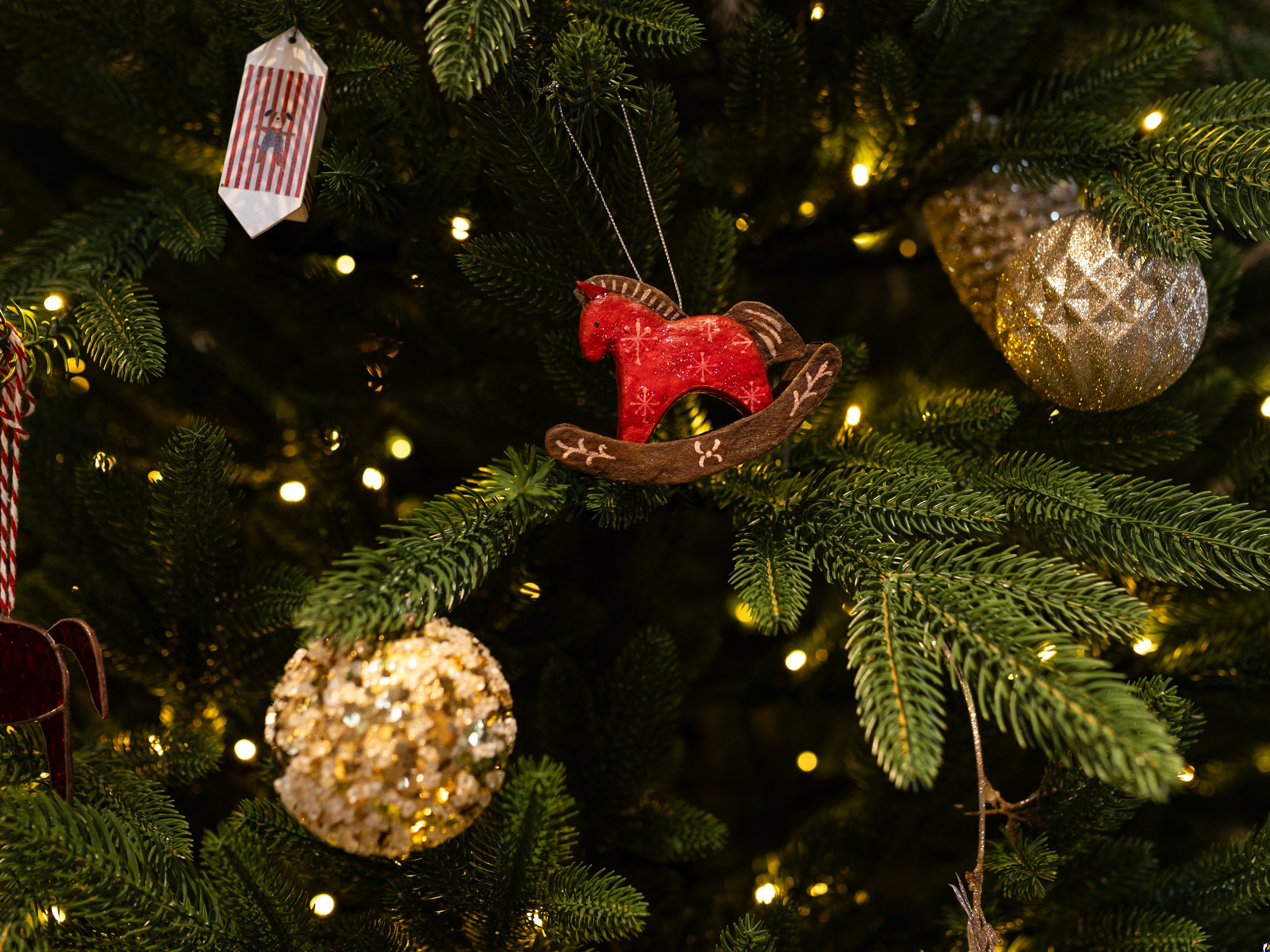Около ста великолепных изделий ручной работы украсили праздничное дерево, каждое из которых несет в себе частичку души своего создателя и отражает культурное наследие Псковской земли. Основными темами оформления стали традиционный «Русский новый год» и символ грядущего года – «Красная огненная лошадь». На ветвях ели оживают керамические и стеклянные лошадки, изящные деревянные резные фигурки, теплые валяные из шерсти игрушки, уютные вязаные украшения и фантазийные изделия в технике папье-маше.