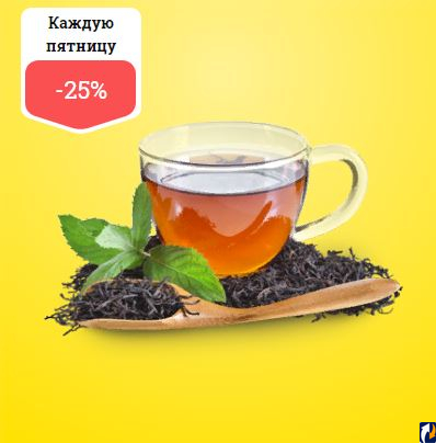 Каждую пятницу 2022 года – скидка 25% на чай по Карте № 1. В акции не участвуют товары марок "365 дней". Акция действует только в магазинах "Гупер Лента" при покупке не более 10 шт. в сутки по Карте № 1. Скидка не распространяется на товары, участвующие в акции с начислением кешбэка в период с 7 июля по 17 августа.