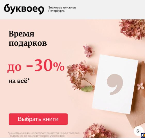 Псковичи могут получить скидки на книги сегодня в сети магазинов «Буквоед». Как сообщается в интернет-рассылке сети магазинов, до 24 февраля при покупке от 1000 рублей можно получить скидку до 20% на заказ.