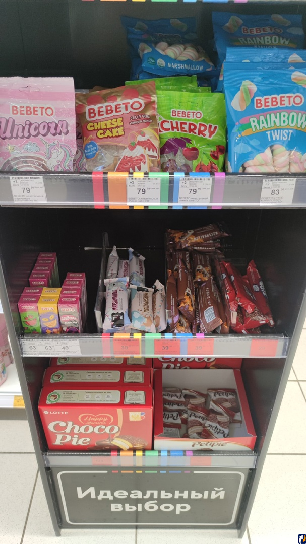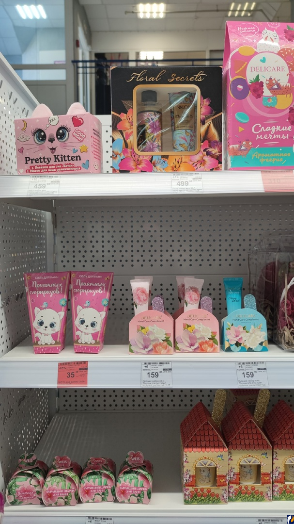 В сети магазинов «Улыбка радуги» появилась отдельная стойка со сладостями и мармеладом. Как говорится, мелочь, а приятно. Тут же рядом есть сезонные предложения с наборами косметики, которые подойдут и для Дня влюбленных и для 8 марта.