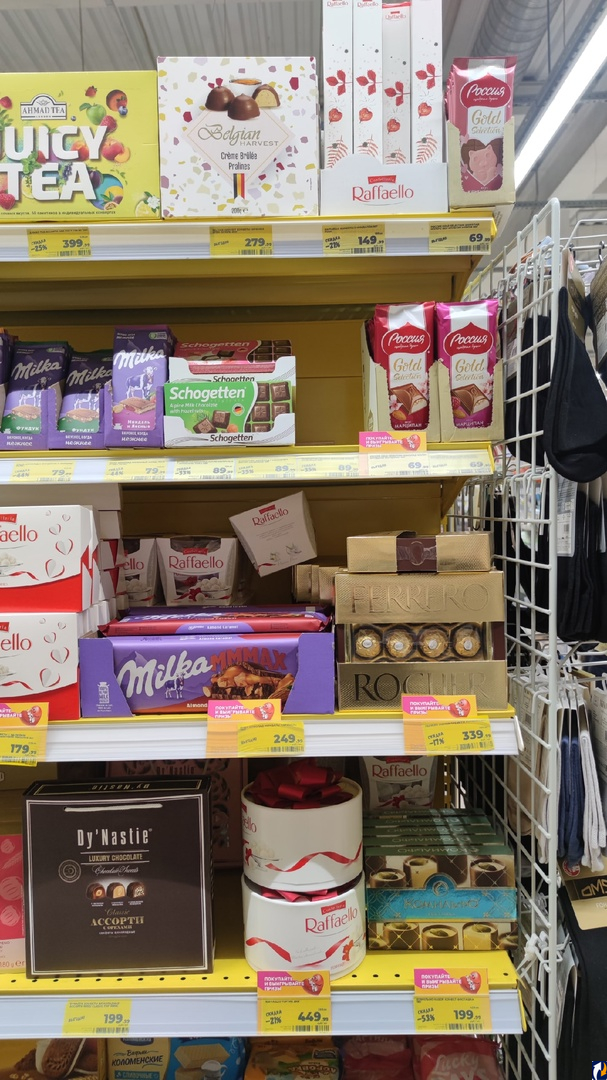 В магазинах сети «Пятерочка» выбор к празднику такой же, как и у «Магнита»: при входе в магазин стоят живые цветы и гиацинты в горшочках. На полках среди выделенного ассортимента сладкие подарки.