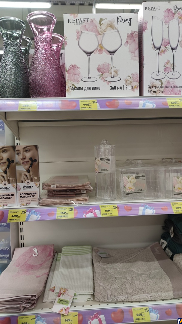 В сети «Магнит Косметик» выбор подарков богаче. Тут можно купить «сердце с руками», которое «смотрит» на вас прямо при входе в магазин. В отдельных стойках широкий выбор посуды и столовой утвари, которую можно подарить любимому человеку, естественно, полно косметики и все это отвечено соответствующим ценником.