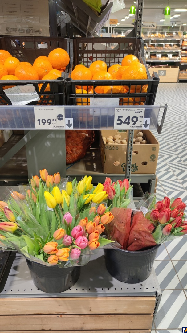 Сеть магазинов «Магнит» не стала особо заморачиваться – на выносных стойках под скидкой есть сладости, конфеты на палочке. На кассах традиционно продаются живые цветы как в срезке, так и гиацинты в горшочках.
