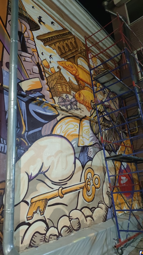 В Пскове за последнее время появилось достаточно много муралов, которые украшают город. Как передает корреспондент ЦДИ, прямо сейчас на стене дома по адресу ул.Труда, 17, рисуют новый мурал.