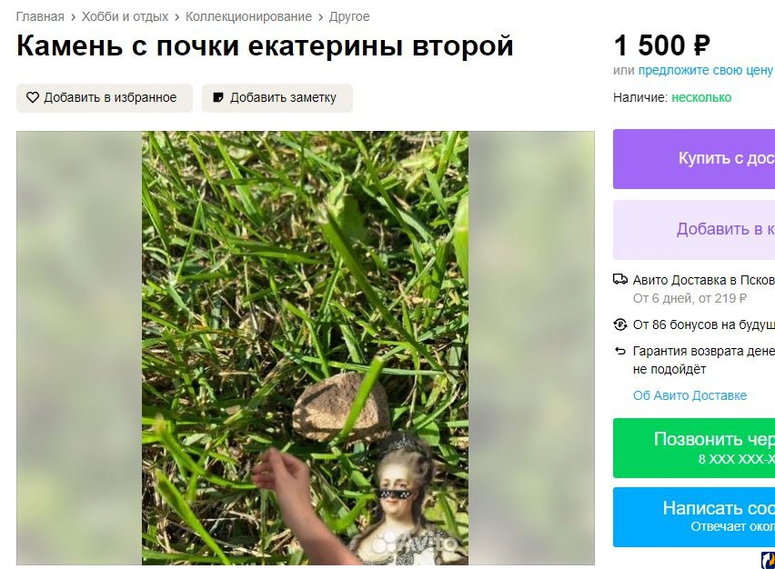 Максимально сумасшедшее объявление было выложено с названием «камень с почки екатерины второй». Справедливости ради нужно заметить, что на данный момент объявление уже снято, или купили камень расчудесный, или забанили объявление за неуважение к императрице. За камень хотели получить 1500 рублей, рассматривали обмен на 10 литров кваса или даже машину. Понятно, что объявление шуточное, оттого и провисело всего ничего, но интернет помнит все.