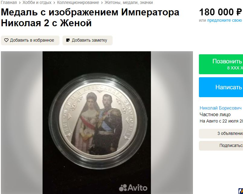 Медаль с изображением императора Николая 2 продают в Пскове за 180 тысяч рублей
